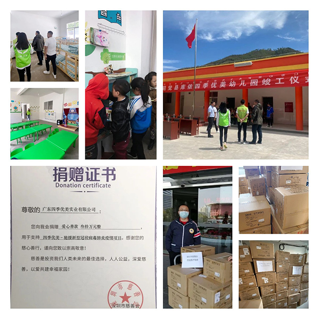 賑災捐款,參與健康類公益救助項目,捐建校舍、橋梁,改造校園設施等,檢驗著四季優美投身公益活動的成色。深圳關愛行動“十佳愛心企業”提名獎的殊榮,是對四季優美長期堅持公益的肯定。而逐年推進的“暖冬”活動及“一加一”資助行動,更已成為具有四季優美文化內涵的公益品牌。